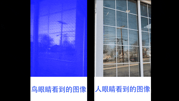 学者通过鸟眼睛和人眼看到的图像不同,研究出了一种新的防鸟撞产品--隐形防鸟撞膜。