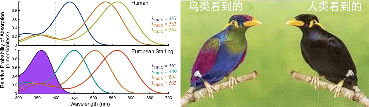 左图为人和紫翅椋鸟视锥细胞对光的敏感性差异图,图中的紫色部分,对人眼是不可见的,但对很多鸟类,却是可见的。
